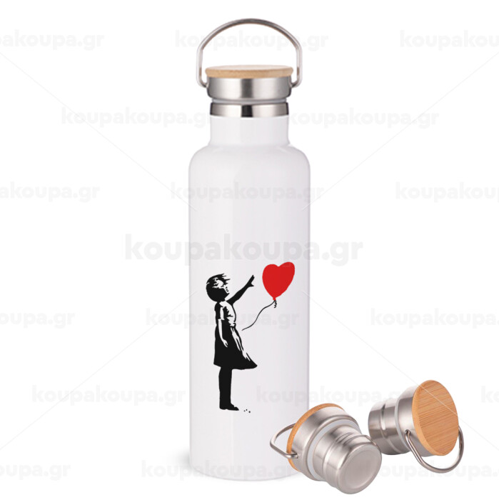Banksy (Hope), Μεταλλικό παγούρι θερμός (Stainless steel) Λευκό με ξύλινο καπάκι (bamboo), διπλού τοιχώματος, 750ml