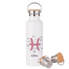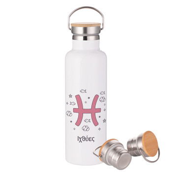Ζώδια Ιχθύες, Μεταλλικό παγούρι θερμός (Stainless steel) Λευκό με ξύλινο καπάκι (bamboo), διπλού τοιχώματος, 750ml
