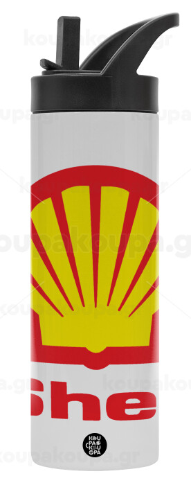 Πρατήριο καυσίμων SHELL, Μεταλλικό παγούρι θερμός με καλαμάκι & χειρολαβή, ανοξείδωτο ατσάλι (Stainless steel 304), διπλού τοιχώματος, 600ml