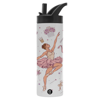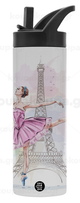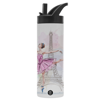 Ballerina in Paris, Μεταλλικό παγούρι θερμός με καλαμάκι & χειρολαβή, ανοξείδωτο ατσάλι (Stainless steel 304), διπλού τοιχώματος, 600ml