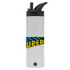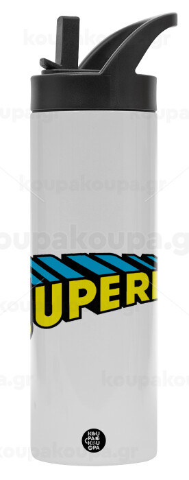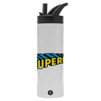 Superman vintage, Μεταλλικό παγούρι θερμός με καλαμάκι & χειρολαβή, ανοξείδωτο ατσάλι (Stainless steel 304), διπλού τοιχώματος, 600ml