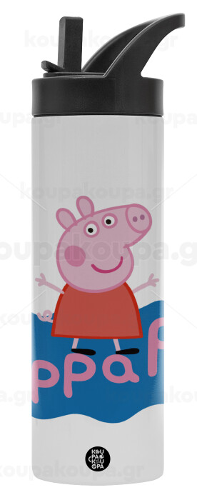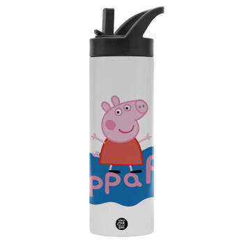 Πέππα το γουρουνάκι μπλε με όνομα, Μεταλλικό παγούρι θερμός με καλαμάκι & χειρολαβή, ανοξείδωτο ατσάλι (Stainless steel 304), διπλού τοιχώματος, 600ml