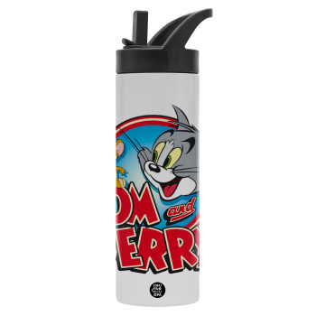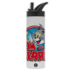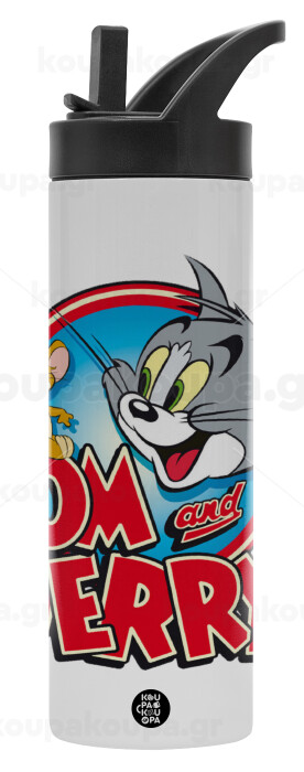 Τομ και Τζέρι, Μεταλλικό παγούρι θερμός με καλαμάκι & χειρολαβή, ανοξείδωτο ατσάλι (Stainless steel 304), διπλού τοιχώματος, 600ml