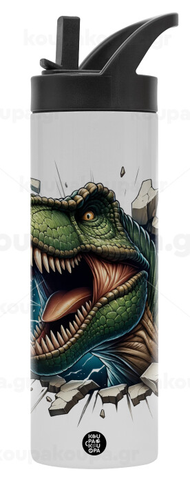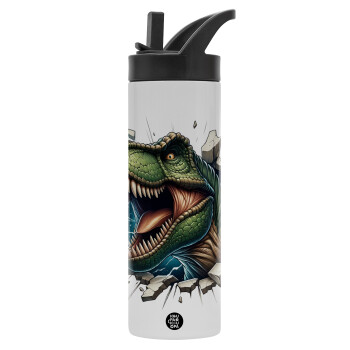 Dinosaur break wall, Μεταλλικό παγούρι θερμός με καλαμάκι & χειρολαβή, ανοξείδωτο ατσάλι (Stainless steel 304), διπλού τοιχώματος, 600ml