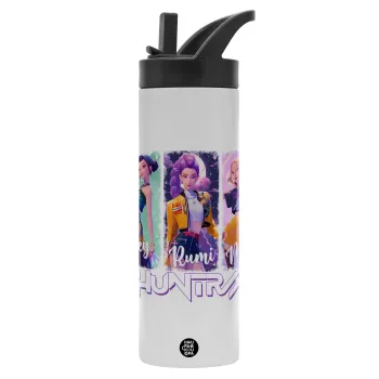 HUNTR/X K-pop girl group, Μεταλλικό παγούρι θερμός με καλαμάκι & χειρολαβή, ανοξείδωτο ατσάλι (Stainless steel 304), διπλού τοιχώματος, 600ml