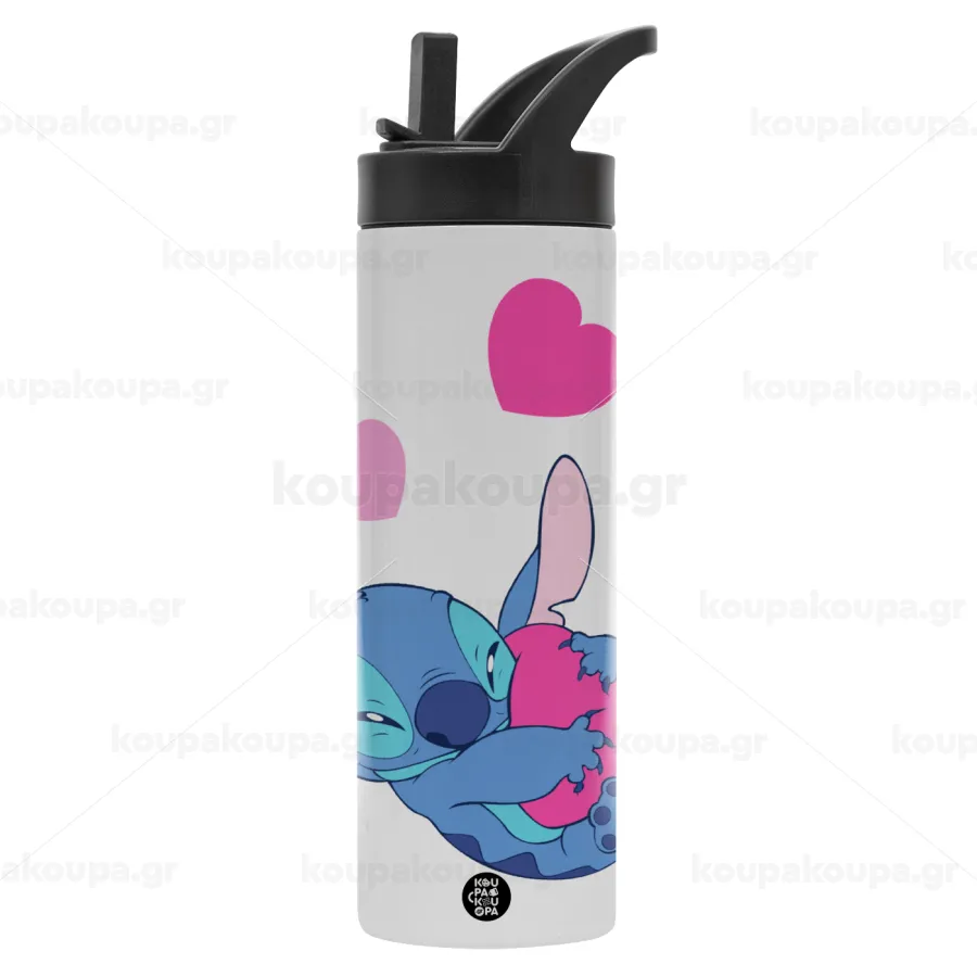 Lilo & Stitch hugs and hearts, Μεταλλικό παγούρι θερμός με καλαμάκι & χειρολαβή, ανοξείδωτο ατσάλι (Stainless steel 304), διπλού τοιχώματος, 600ml
