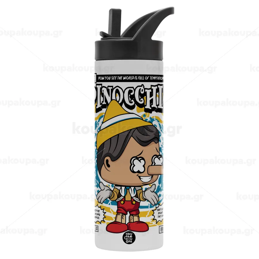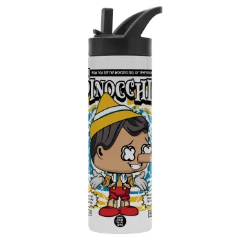 Pinocchio, Μεταλλικό παγούρι θερμός με καλαμάκι & χειρολαβή, ανοξείδωτο ατσάλι (Stainless steel 304), διπλού τοιχώματος, 600ml