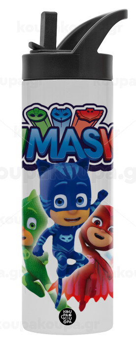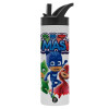 PJ masks, Μεταλλικό παγούρι θερμός με καλαμάκι & χειρολαβή, ανοξείδωτο ατσάλι (Stainless steel 304), διπλού τοιχώματος, 600ml