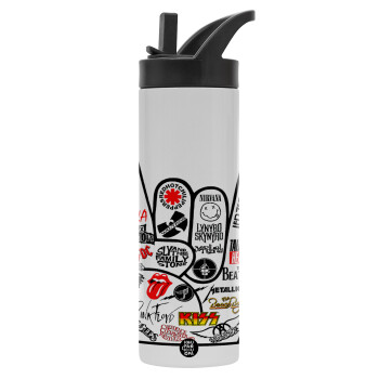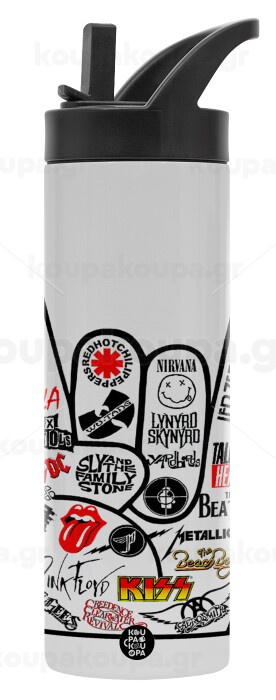 Best Rock Bands hand, Μεταλλικό παγούρι θερμός με καλαμάκι & χειρολαβή, ανοξείδωτο ατσάλι (Stainless steel 304), διπλού τοιχώματος, 600ml