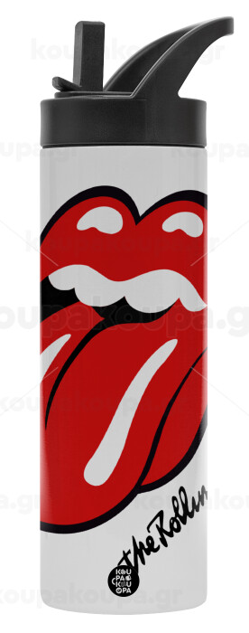 The rolling stones, Μεταλλικό παγούρι θερμός με καλαμάκι & χειρολαβή, ανοξείδωτο ατσάλι (Stainless steel 304), διπλού τοιχώματος, 600ml