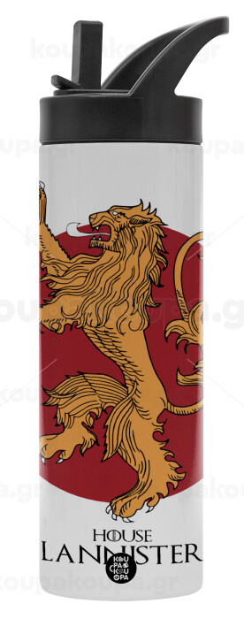 House Lannister GOT, Μεταλλικό παγούρι θερμός με καλαμάκι & χειρολαβή, ανοξείδωτο ατσάλι (Stainless steel 304), διπλού τοιχώματος, 600ml