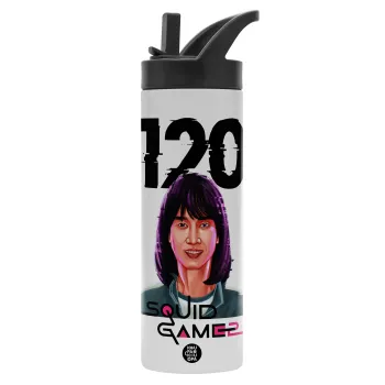 Squid game 120 Cho Hyun-ju, Μεταλλικό παγούρι θερμός με καλαμάκι & χειρολαβή, ανοξείδωτο ατσάλι (Stainless steel 304), διπλού τοιχώματος, 600ml