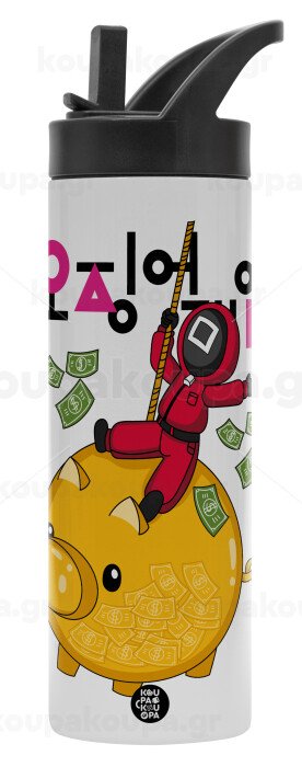 Squid game money pig, Μεταλλικό παγούρι θερμός με καλαμάκι & χειρολαβή, ανοξείδωτο ατσάλι (Stainless steel 304), διπλού τοιχώματος, 600ml