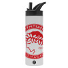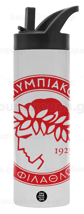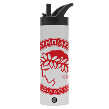 Ολυμπιακός, Μεταλλικό παγούρι θερμός με καλαμάκι & χειρολαβή, ανοξείδωτο ατσάλι (Stainless steel 304), διπλού τοιχώματος, 600ml