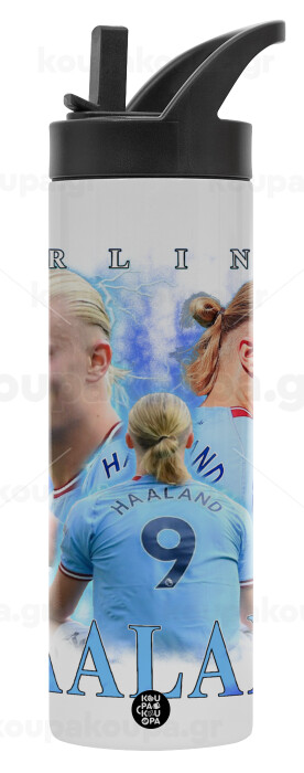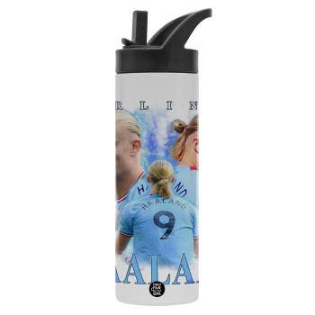 Erling Haaland, Μεταλλικό παγούρι θερμός με καλαμάκι & χειρολαβή, ανοξείδωτο ατσάλι (Stainless steel 304), διπλού τοιχώματος, 600ml