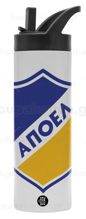FC ΑΠΟΕΛ Λευκωσίας, Μεταλλικό παγούρι θερμός με καλαμάκι & χειρολαβή, ανοξείδωτο ατσάλι (Stainless steel 304), διπλού τοιχώματος, 600ml