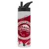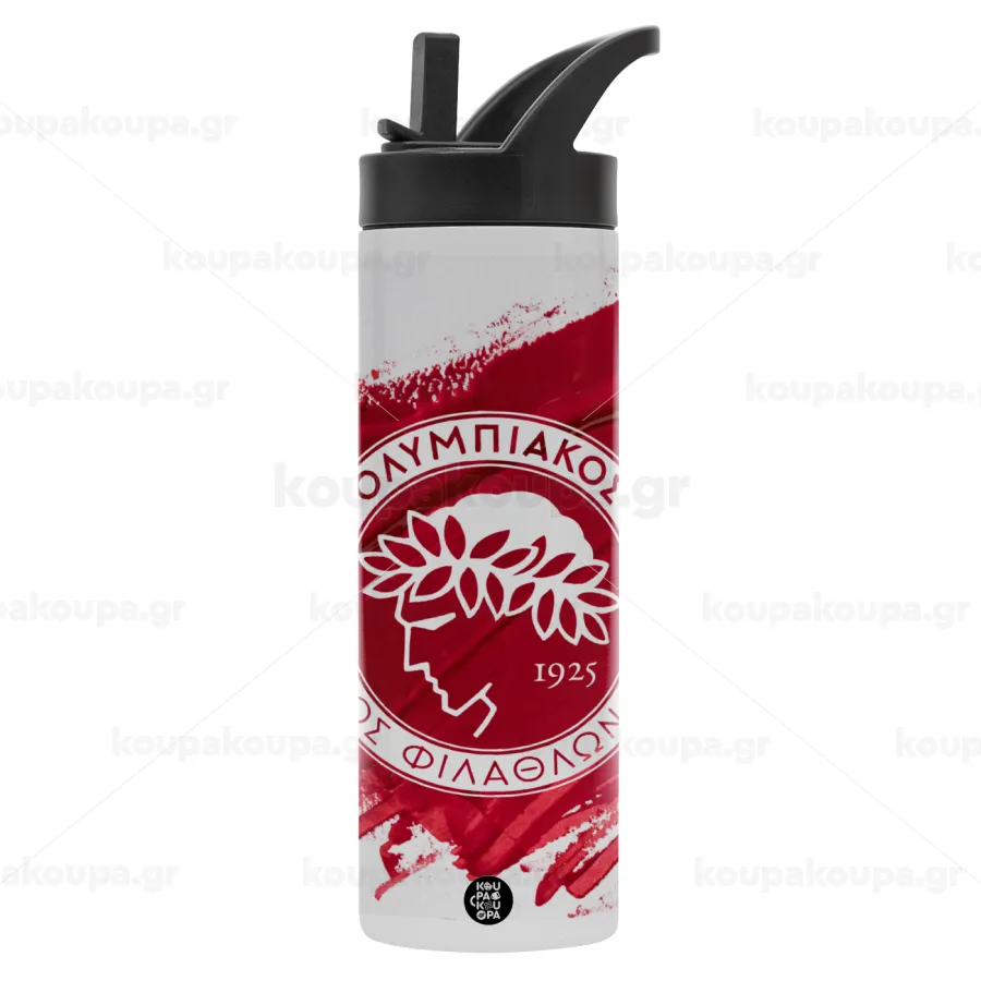 Olympiacos F.C., Μεταλλικό παγούρι θερμός με καλαμάκι & χειρολαβή, ανοξείδωτο ατσάλι (Stainless steel 304), διπλού τοιχώματος, 600ml