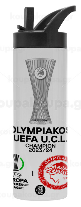 Ολυμπιακός νικητής UEFA Europa Conference League Champion 2023/24, Μεταλλικό παγούρι θερμός με καλαμάκι & χειρολαβή, ανοξείδωτο ατσάλι (Stainless steel 304), διπλού τοιχώματος, 600ml
