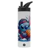 Stitch Basketball, Μεταλλικό παγούρι θερμός με καλαμάκι & χειρολαβή, ανοξείδωτο ατσάλι (Stainless steel 304), διπλού τοιχώματος, 600ml