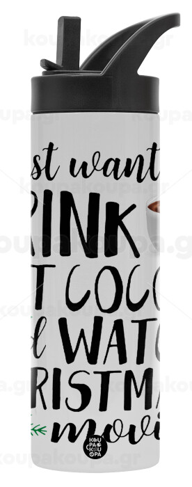 I just want to drink hot cocoa and watch christmas movies, Μεταλλικό παγούρι θερμός με καλαμάκι & χειρολαβή, ανοξείδωτο ατσάλι (Stainless steel 304), διπλού τοιχώματος, 600ml