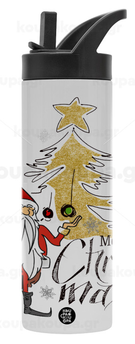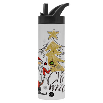 Santa Claus gold, Μεταλλικό παγούρι θερμός με καλαμάκι & χειρολαβή, ανοξείδωτο ατσάλι (Stainless steel 304), διπλού τοιχώματος, 600ml