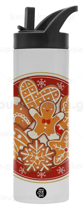 xmas cookies, Μεταλλικό παγούρι θερμός με καλαμάκι & χειρολαβή, ανοξείδωτο ατσάλι (Stainless steel 304), διπλού τοιχώματος, 600ml