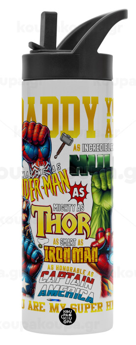 Daddy You Are my Hero, Μεταλλικό παγούρι θερμός με καλαμάκι & χειρολαβή, ανοξείδωτο ατσάλι (Stainless steel 304), διπλού τοιχώματος, 600ml