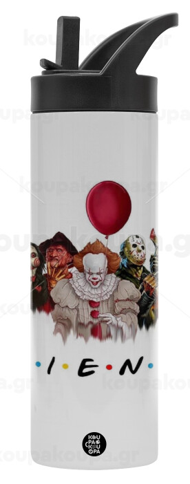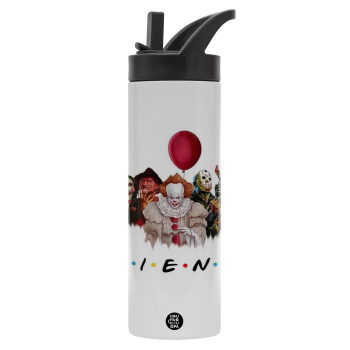 Halloween Friends, Μεταλλικό παγούρι θερμός με καλαμάκι & χειρολαβή, ανοξείδωτο ατσάλι (Stainless steel 304), διπλού τοιχώματος, 600ml