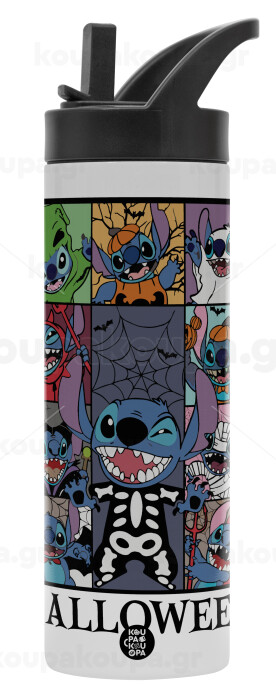 Stitch Halloween, Μεταλλικό παγούρι θερμός με καλαμάκι & χειρολαβή, ανοξείδωτο ατσάλι (Stainless steel 304), διπλού τοιχώματος, 600ml