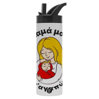 Μανούλα σ'αγαπώ αγκαλιά!, Μεταλλικό παγούρι θερμός με καλαμάκι & χειρολαβή, ανοξείδωτο ατσάλι (Stainless steel 304), διπλού τοιχώματος, 600ml