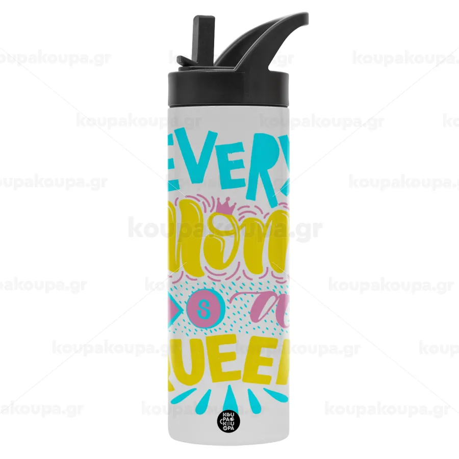 Every mom is a Queen, Μεταλλικό παγούρι θερμός με καλαμάκι & χειρολαβή, ανοξείδωτο ατσάλι (Stainless steel 304), διπλού τοιχώματος, 600ml