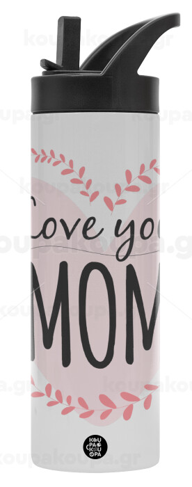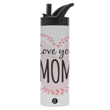 Mother's day I Love you Mom heart, Μεταλλικό παγούρι θερμός με καλαμάκι & χειρολαβή, ανοξείδωτο ατσάλι (Stainless steel 304), διπλού τοιχώματος, 600ml