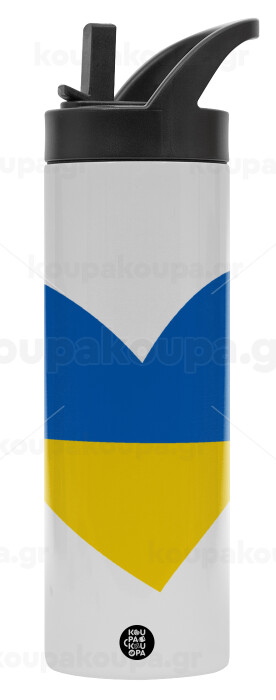 UKRAINE heart, Μεταλλικό παγούρι θερμός με καλαμάκι & χειρολαβή, ανοξείδωτο ατσάλι (Stainless steel 304), διπλού τοιχώματος, 600ml