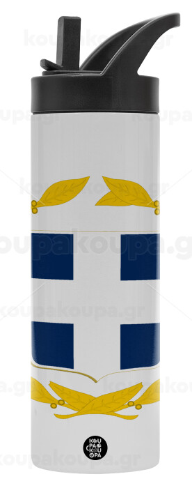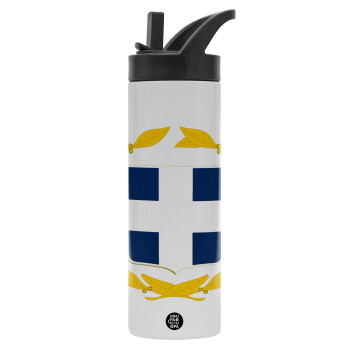Hellas Εθνόσημο, Μεταλλικό παγούρι θερμός με καλαμάκι & χειρολαβή, ανοξείδωτο ατσάλι (Stainless steel 304), διπλού τοιχώματος, 600ml