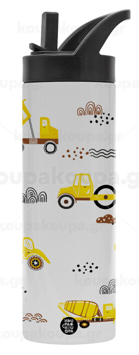 Αμαξάκια φορτωτές και μπουλντόζες, Μεταλλικό παγούρι θερμός με καλαμάκι & χειρολαβή, ανοξείδωτο ατσάλι (Stainless steel 304), διπλού τοιχώματος, 600ml