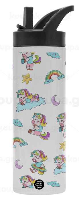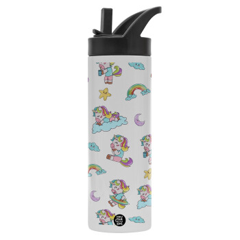 Unicorn pattern, Μεταλλικό παγούρι θερμός με καλαμάκι & χειρολαβή, ανοξείδωτο ατσάλι (Stainless steel 304), διπλού τοιχώματος, 600ml