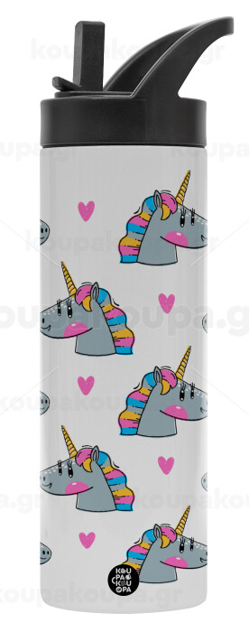 Unicorn, Μεταλλικό παγούρι θερμός με καλαμάκι & χειρολαβή, ανοξείδωτο ατσάλι (Stainless steel 304), διπλού τοιχώματος, 600ml