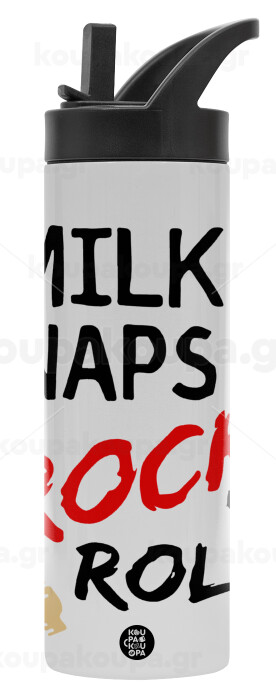 milk naps and Rock n' Roll, Μεταλλικό παγούρι θερμός με καλαμάκι & χειρολαβή, ανοξείδωτο ατσάλι (Stainless steel 304), διπλού τοιχώματος, 600ml