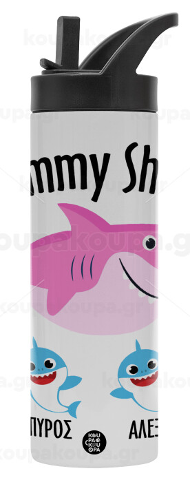 Mommy Shark (με ονόματα παιδικά), Μεταλλικό παγούρι θερμός με καλαμάκι & χειρολαβή, ανοξείδωτο ατσάλι (Stainless steel 304), διπλού τοιχώματος, 600ml