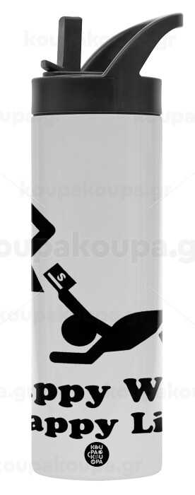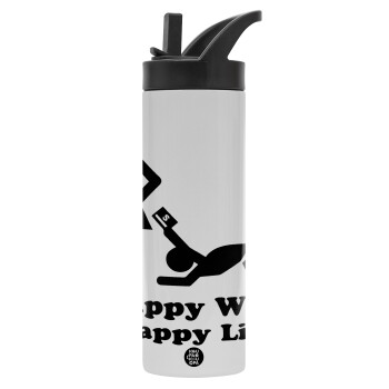 Happy Wife, Happy Life, Μεταλλικό παγούρι θερμός με καλαμάκι & χειρολαβή, ανοξείδωτο ατσάλι (Stainless steel 304), διπλού τοιχώματος, 600ml
