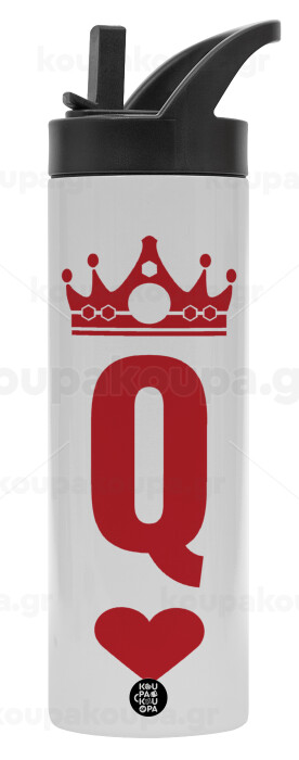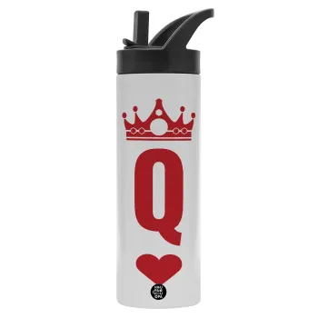 Queen, Μεταλλικό παγούρι θερμός με καλαμάκι & χειρολαβή, ανοξείδωτο ατσάλι (Stainless steel 304), διπλού τοιχώματος, 600ml