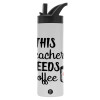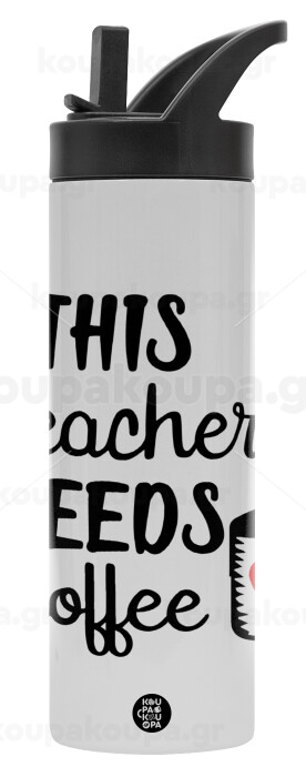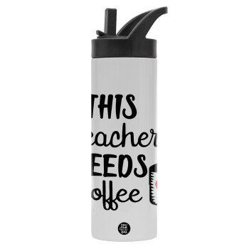 Τhis teacher needs coffee, Μεταλλικό παγούρι θερμός με καλαμάκι & χειρολαβή, ανοξείδωτο ατσάλι (Stainless steel 304), διπλού τοιχώματος, 600ml