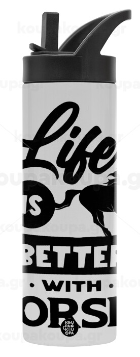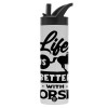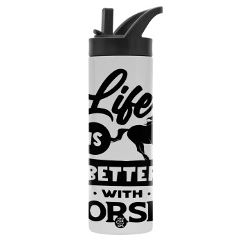 Life is Better with a Horses, Μεταλλικό παγούρι θερμός με καλαμάκι & χειρολαβή, ανοξείδωτο ατσάλι (Stainless steel 304), διπλού τοιχώματος, 600ml