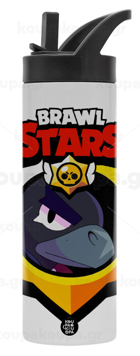 Brawl Stars Crow, Μεταλλικό παγούρι θερμός με καλαμάκι & χειρολαβή, ανοξείδωτο ατσάλι (Stainless steel 304), διπλού τοιχώματος, 600ml