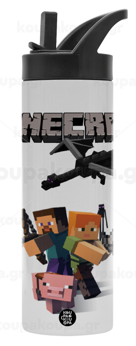 Minecraft Alex, Μεταλλικό παγούρι θερμός με καλαμάκι & χειρολαβή, ανοξείδωτο ατσάλι (Stainless steel 304), διπλού τοιχώματος, 600ml
