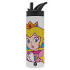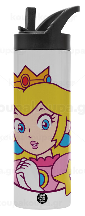 Princess Peach, Μεταλλικό παγούρι θερμός με καλαμάκι & χειρολαβή, ανοξείδωτο ατσάλι (Stainless steel 304), διπλού τοιχώματος, 600ml