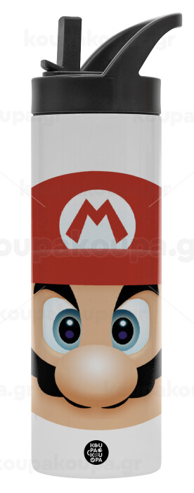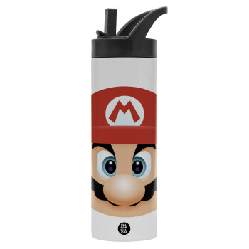 Super mario flat, Μεταλλικό παγούρι θερμός με καλαμάκι & χειρολαβή, ανοξείδωτο ατσάλι (Stainless steel 304), διπλού τοιχώματος, 600ml