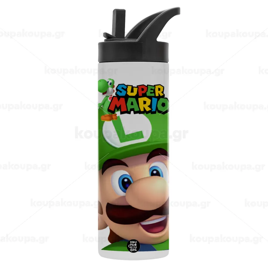 Super mario Luigi, Μεταλλικό παγούρι θερμός με καλαμάκι & χειρολαβή, ανοξείδωτο ατσάλι (Stainless steel 304), διπλού τοιχώματος, 600ml