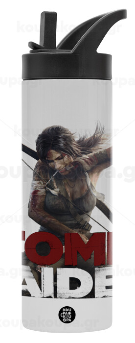 Tomb raider, Μεταλλικό παγούρι θερμός με καλαμάκι & χειρολαβή, ανοξείδωτο ατσάλι (Stainless steel 304), διπλού τοιχώματος, 600ml