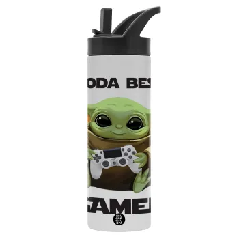 Yoda Best Gamer, Μεταλλικό παγούρι θερμός με καλαμάκι & χειρολαβή, ανοξείδωτο ατσάλι (Stainless steel 304), διπλού τοιχώματος, 600ml
